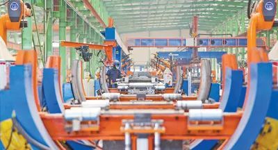 河南骏通车辆有限公司是一家集专用车、整车研发、生产与制造于一体的民营企业,公司年产能6万辆,产品远销俄罗斯、越南、乌兹别克斯坦及非洲多个国家和地区。图为5月24日,在该公司零部件智能焊接车间,生产线正全速运转,工人忙碌地进行焊接作业。 孙 猛 摄(影像中国)